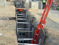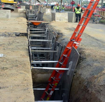Ground Support Systems Aluminum Hydraulic Shoring are an excellent lightweight resource for working around existing utilities, supporting trench walls near structures, curbs, and/or sidewalks. They can also be used for pipe installations where machines are unavailable. The hydraulic shores can be installed and removed by hand from the surface of the trench, thus avoiding the risk of working in an unshored trench.